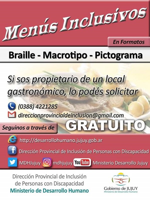 Se informó que la invitación a los comercios jujeños tiene por objetivo principal que se puedan crear menús o cualquier tipo promoción en tres vías de comunicación: braille, macrotipo y pictograma, de esta manera, se facilitará la lectura a personas con diferentes tipos de patologías.