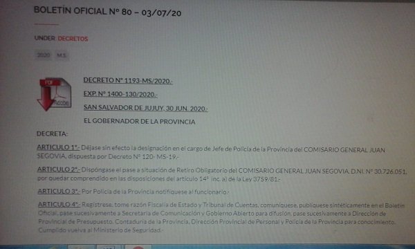 Apenas pasaron unos 10 días, el gobierno despide a Segovia y lo pasa a retiro obligatorio. El decreto N°1193 que lleva la firma de Gerardo Morales dice: “Dejase sin efecto la designación en el cargo de Jefe de Policía de la Provincia del comisario general Juan Segovia. Dispóngase el pase a situación de Retiro Obligatorio”. Estuvo seis meses al frente de la policía, pasó sin pena y gloria.
