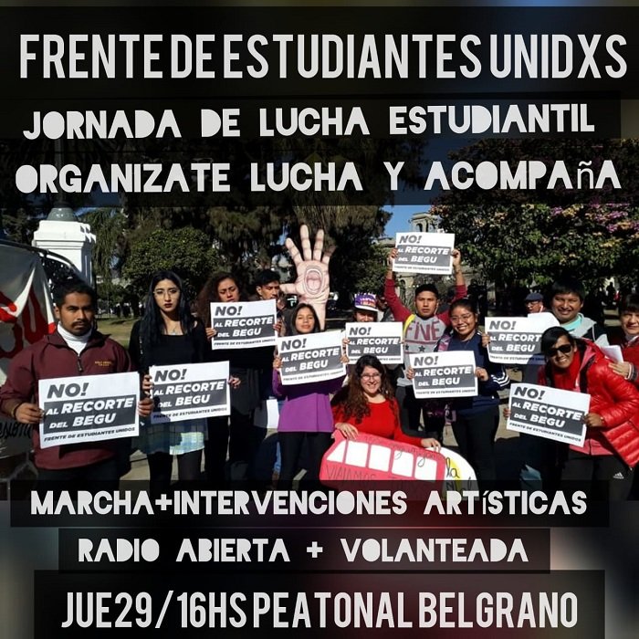 El Frente de Estudiantes Unides convoca a una nueva marcha, para el próximo jueves a las 16.00 horas, a la comunidad educativa en defensa del Boleto Estudiantil Gratuito Universal (Begu) y Boleto Estudiantil Gratuito Universal Provincial (Begup). Convocamos a los estudiantes de toda la provincia a la marcha. También piden mayor presupuesto para la educación pública