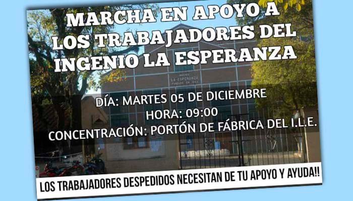 En apoyo a los trabajadores despedidos del Ingenio La Esperanza, familiares autoconvocados llaman a concentrarse este martes a las 9 de la mañana en el portón de la empresa, para marchar luego hacia San Pedro de Jujuy.