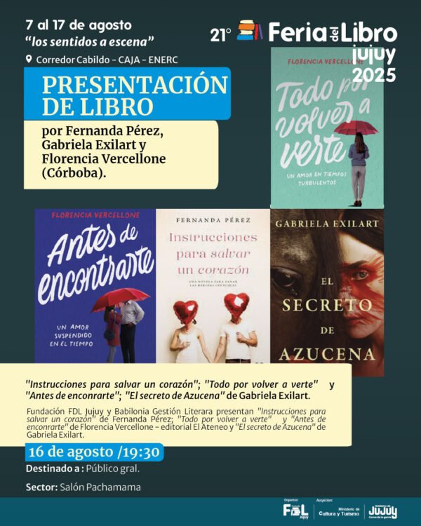 La Feria del Libro Jujuy “Los sentidos a escena” se prepara para vivir una de sus jornadas más destacadas, durante este sábado, las reconocidas escritoras Fernanda Pérez, Florencia Vercellone y Gabriela Exilart compartirán con el público charlas, reflexiones y la presentación de sus más recientes obras.