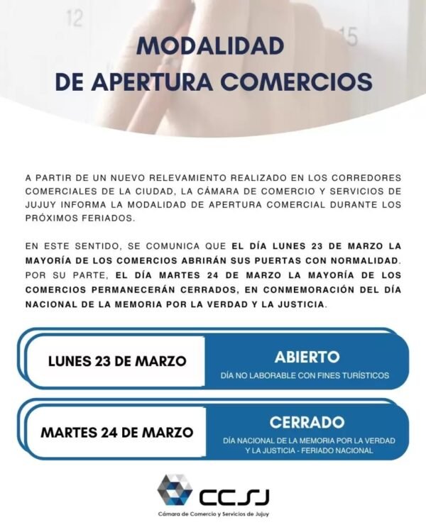 La entidad comunicó luego de un relevamiento realizado en los corredores comerciales de San Salvador de Jujuy, el día lunes 23 de marzo los comercios abrirán con normalidad sus puertas. En el caso del martes 24, Día de la Memoria por la Verdad y la Justicia, la mayoría de los comercios permanecerán cerrados. En caso de trabajar, se debe aplicar los artículos 166 y 167 de la Ley de Contrato de Trabajo Nº20.744.