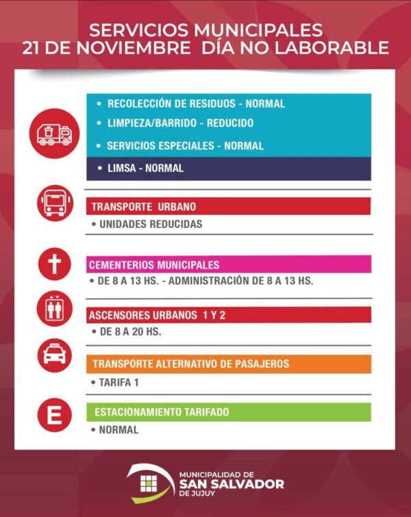 La Municipalidad de San Salvador de Jujuy informó a la opinión pública cómo se brindarán los servicios que presta la comuna por el feriado nacional por el Día de la Soberanía Nacional, que se conmemora el próximo lunes y el feriado puente turístico de este viernes