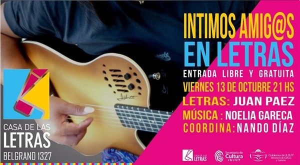 Este viernes a las 21.00 horas, habrá una nueva cita en el Ciclo “Íntimos amigos en letras”, que coordina el músico Nando Díaz. Estarán Juan Páez en poesía y Noelia Gareca en música. La presentación será en la Casa de las Letras.