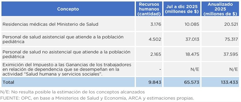 En este sentido, el informe especifica que equiparar las remuneraciones de personal destinado a la asistencia pediátrica (asistencial y no asistencial) y residentes al nivel salarial de noviembre de 2023 implicaría un gasto adicional por parte del Ejecutivo, entre julio y diciembre, de $65.573 millones. Anualizada, esa erogación alcanzaría los $133.433 millones.