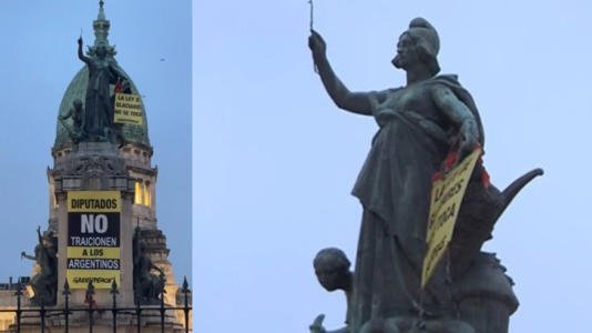 Desde temprano, la organización Greenpeace realizó una intervención en el monumento de la plaza, donde activistas desplegaron carteles con mensajes directos a los legisladores: Diputados, no traicionen a los argentinos y La ley de Glaciares no se toca.