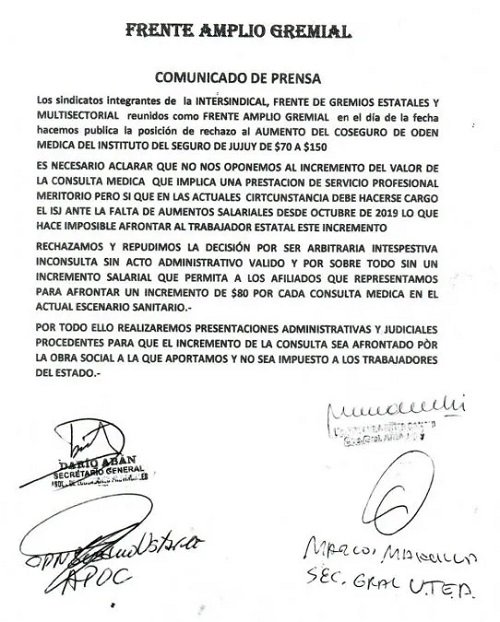 El Frente Amplio Gremial rechazó el aumento del coseguro de orden médica del Instituto de Seguros de Jujuy, que de 70 pesos pasó a 150 pesos.