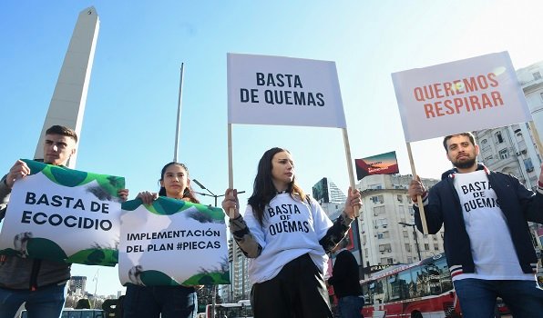 La manifestación en el Obelisco estuvo acompañada por más de una docena de jóvenes rosarinos que desplegaron una bandera con que pedía «Basta de quemas» y sostenían pancartas con consignas como «Ley de humedales ya» y «Queremos respirar».
