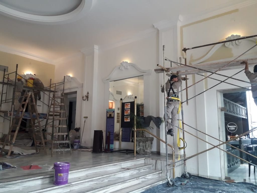 Una vez finalizada la reciente reparación de la recova. Los equipos del Ministerio de Infraestructura iniciaron los trabajos de pintura dentro del teatro.