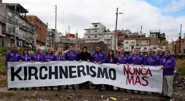 En la imagen se puede ver a los dirigentes y candidatos una bandera con el slogan «Kirchnerismo Nunca Más», utilizando la icónica tipografía del informe elevado durante el Juicio a las Juntas Miiltares. Salvo Milei, el resto de los presentes vistió un buzo color violeta, tono insignia de La Libertad Avanza, dejando atrás la metáfora de «pintar la Provincia» de ese pigmento.