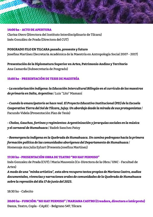 El Centro Universitario Tilcara invita a toda la comunidad a la “Jornada de Posgrado Filo en Tilcara: investigaciones y miradas desde el territorio”, en la que se van a presentar trabajos realizados en el marco de las maestrías en Antropología Social y en Pedagogías Críticas.