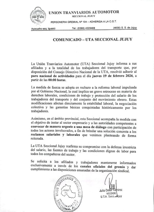 La confirmación local llegó de la mano de Julio César Ramírez, veedor interventor de la UTA seccional Jujuy, quien aseguró: «Sí, hay que adherir».