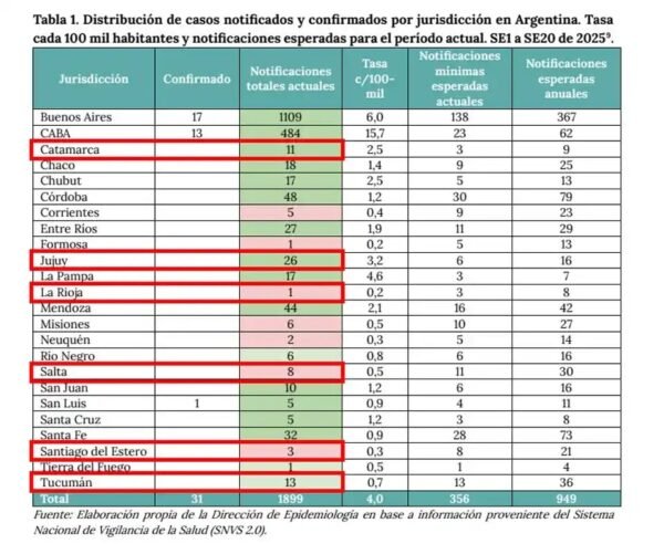 En el caso de la provincia de Jujuy, el número de notificaciones mínimas esperables es de 6, por tal motivo, la provincia se suma a los trece distritos que reportaron notificaciones por encima de las esperadas para esta época del año.