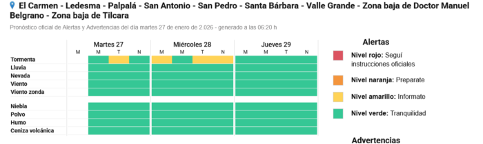 El sistema de alerta señala que las siguientes zonas están afectadas: las cordilleras de Cochinoca, de Rinconada, de Santa Catalina y de Susques, junto a la Puna de Cochinoca, de Humahuaca, de Rinconada, de Santa Catalina, de Tilcara, de Tumbaya y Yavi. También los departamentos de El Carmen, Ledesma, Palpalá, San Antonio, San Pedro, Santa Bárbara, Valle Grande, Zona baja de Doctor Manuel Belgrano y zona baja de Tilcara.