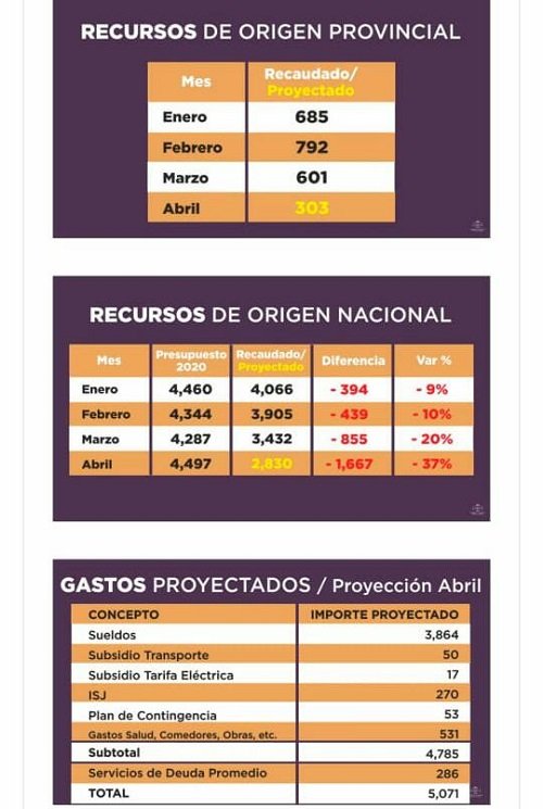 Por su parte el ministro de Hacienda y Finanzas de Jujuy, Carlos Sadir, dijo que «hubo una abrupta caída en la recaudación y recursos de tributos provinciales» al detallar que en el mes de febrero ingresaron 792 millones de pesos, en marzo solo se obtuvo 601 millones de pesos y para abril se proyecta una recaudación de 303 millones de pesos.