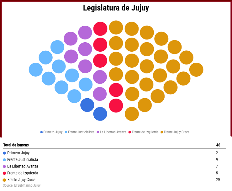 El oficialismo radical, hoy denominado Jujuy Crece, obtuvo una docena de bancas y totalizará 25 legisladores, lo que le garantiza la mayoría. Sin embargo, ya no tendrá los dos tercios con los que se manejó durante la última década.