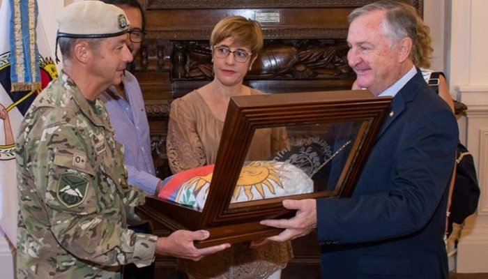 El Gobierno de la Provincia, a través del Ministro de Gobierno y Justicia, Agustín Perassi y el secretario de Cultura, Luis Medina Zar, acompañados por la diputada Nacional, Alejandra Burgos, hicieron entrega de una réplica de la Bandera Nacional de la Libertad Civil al Mayor Mario Cristóbal, segundo jefe del Regimiento de Infantería de Montaña 20, Cazadores de los Andes, quien será el encargado custodiar la enseña en el inicio de su derrotero hasta flamear en la Base Belgrano II de la Antártida Argentina.