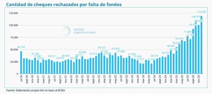 Según un informe del Instituto Argentina Grande elaborado con datos del Banco Central (BCRA), en el último mes del año se registraron 119.285 valores rechazados.