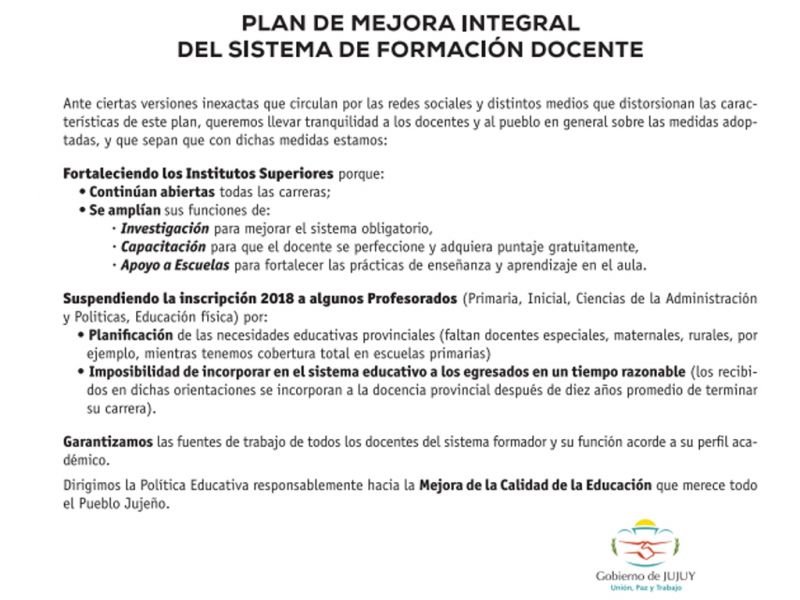 “Ante ciertas versiones inexactas que distorsionan el plan, queremos llevar tranquilidad a los docentes y el pueblo en general, sobre las medidas adoptadas y que sepan que con dichas medidas: