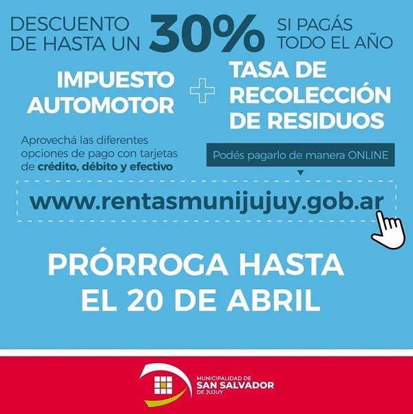 En tanto, Agustina Apaza, secretaria de Hacienda, anunció la prórroga hasta el 20 de abril del “pago anticipado” de todos los tributos municipales, “mientras están restringidas las atenciones públicas, tenemos los canales virtuales en la página www.rentasmunijujuy.gob.ar pueden consultar sobre los pagos”.