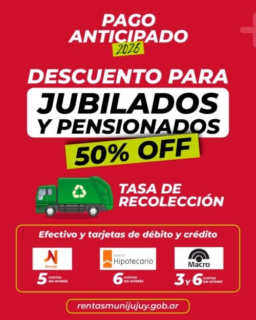 El plan contempla importantes descuentos, entre ellos un 30 % en el Impuesto Automotor y un 20 % en la tasa de Recolección de Residuos. A estos beneficios se suma un 10 % adicional para los contribuyentes que accedan al beneficio de “Buen Contribuyente”, es decir, aquellos que hayan cumplido en tiempo y forma con sus obligaciones. Asimismo, se agrega un 5 % extra para quienes realicen el pago a través del sitio web oficial: rentasmunijujuy.gov.ar.