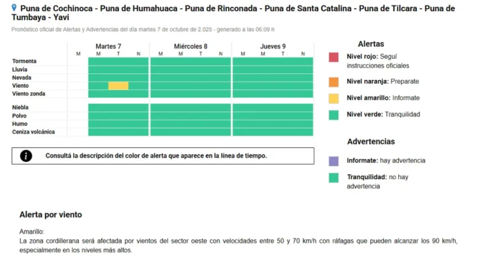 El Servicio Meteorológico Nacional (SMN) renovó la alerta amarilla para las próximas horas por intensos vientos en la zona cordillerana de la provincia de Jujuy.