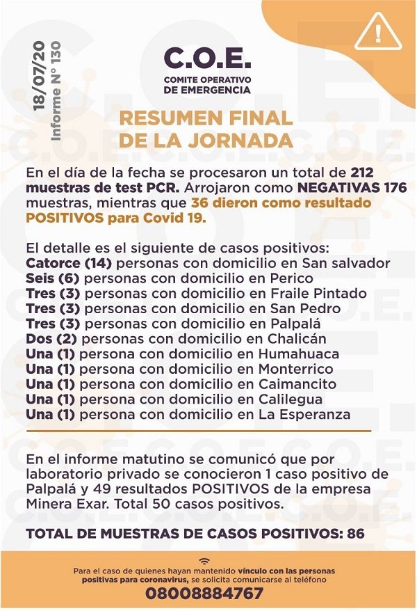 En el informe matutino, el organismo informó 75 positivos de los cuales 49 pertenecían a trabajadores de Minera Exar y 1 de Palpalá.
