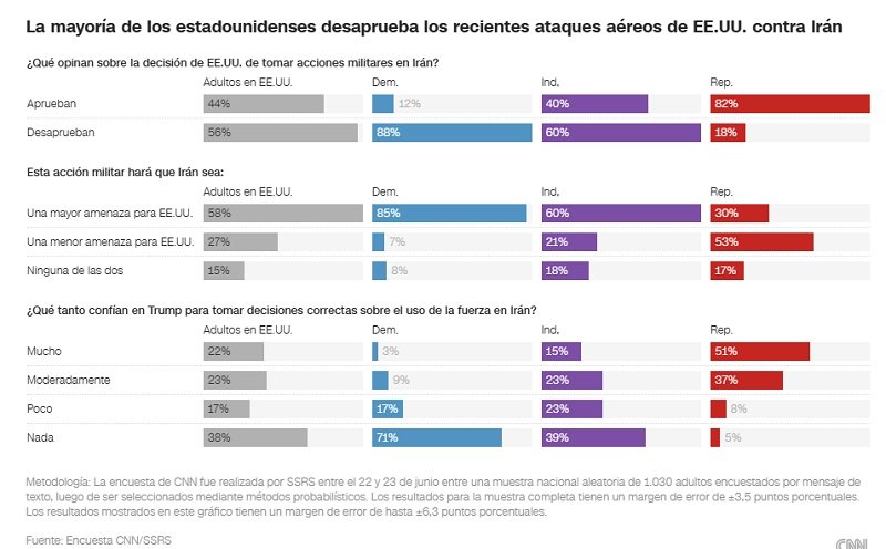 La decisión del presidente Donald Trump de lanzar ataques aéreos contra Irán es ampliamente impopular entre los estadounidenses, según una nueva encuesta de CNN realizada por SSRS tras los ataques.