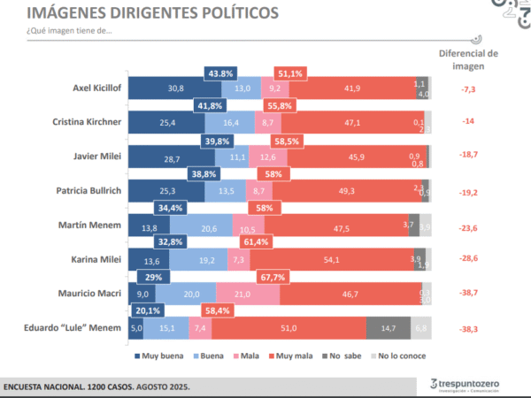 En cuanto a la imagen positiva, el que se encuentra en la cima del podio es el gobernador bonaerense Axel Kicillof que entre imagen muy buena y buena suma 43,8 por ciento. Para desgracia de Milei, la que ocupa el segundo puesto es Cristina Kirchner con 41,8 por ciento. Luego recién aparece Milei con una imagen positiva de 39,8 por ciento. Este dato confirma la caída presidencial porque ya bajó del 40 por ciendo, cuando la misma consultora lo ubicaba en el 52 por ciento hace apenas 7 semanas.