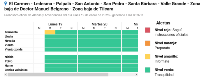 El Servicio Meteorológico Nacional (SMN) anuncio que Jujuy sigue con la alerta amarilla por intensas lluvias, pero solo para mañana de este lunes. Pasó de naranja a amarilla