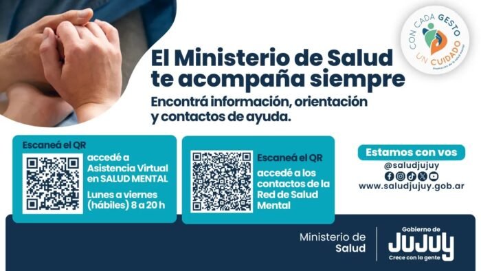 El Ministerio de Salud de Jujuy informa que la provincia cuenta con una red integral de salud mental disponible las 24 horas, con dispositivos de atención, líneas telefónicas y equipos profesionales preparados para acompañar a personas que atraviesan situaciones complejas, desde una mirada empática y respetuosa, con foco en el cuidado, la escucha y el acompañamiento oportuno.