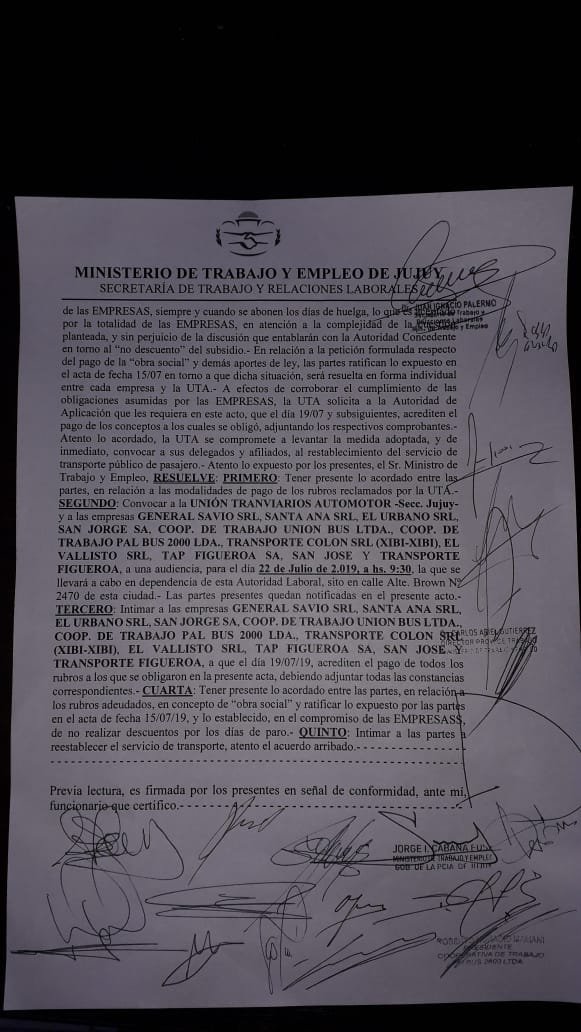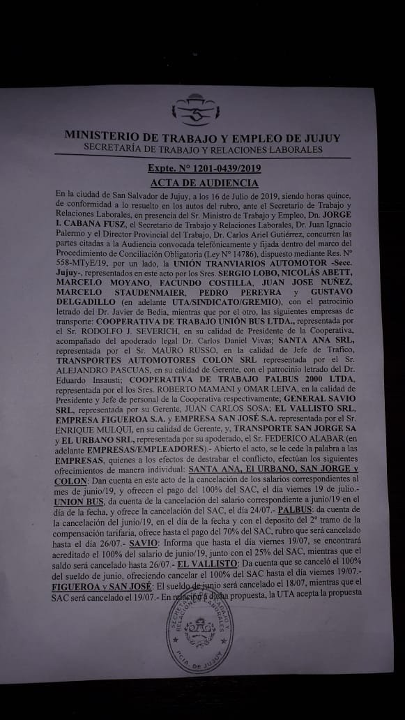 En la tarde del martes, los empresarios y los referentes de la UTA llegaron a un acuerdo, durante una nueva reunión que se llevó a cabo, en el Ministerio de Trabajo comprometiéndose a abonar los salarios y aguinaldos adeudados hasta día el viernes.