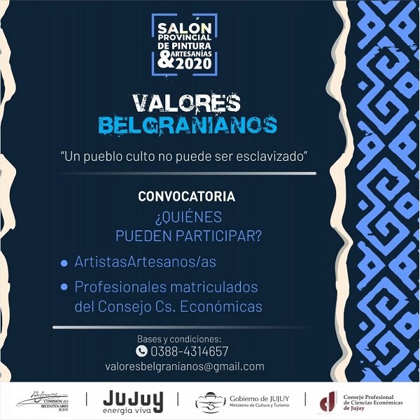 El plazo para presentar la carpeta digital es hasta el 28 de setiembre 2020 a las 18 horas, al mail valoresbelgranianos@gmail.com. Para mayor información podrán dirigirse al Teléfono Nro. 0388-4314657 y e-mail valoresbelgranianos@gmail.com de la Secretaria de Cultura de la Provincia de Jujuy.