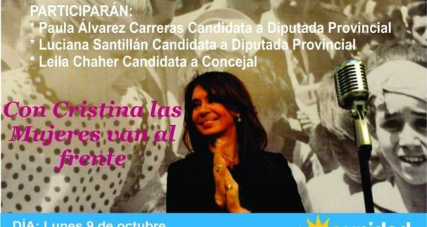 El encuentro, denominado “Con Cristiana, las Mujeres van al frente”, participarán las candidatas a Diputadas Provinciales, Paula Álvarez Carreras y Luciana Santillán, en primer y segundo término respectivamente- y la candidata a Concejal en primer término, Leila Chaher.