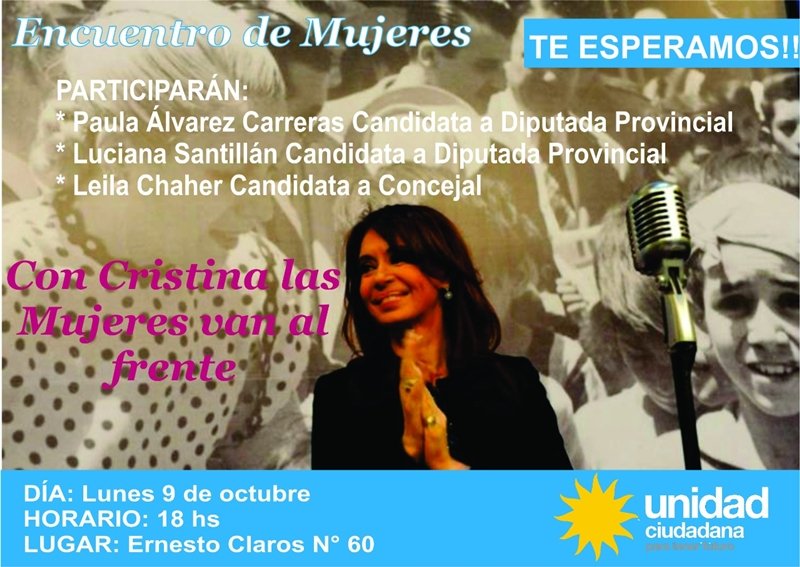 El Frente Unidad Ciudadana convoca a un encuentro de Mujeres, con el fin de debatir y escuchar propuestas e intercambiar aportes y miradas sobre el rol de la mujer en la realidad política económica y social de nuestra provincia.