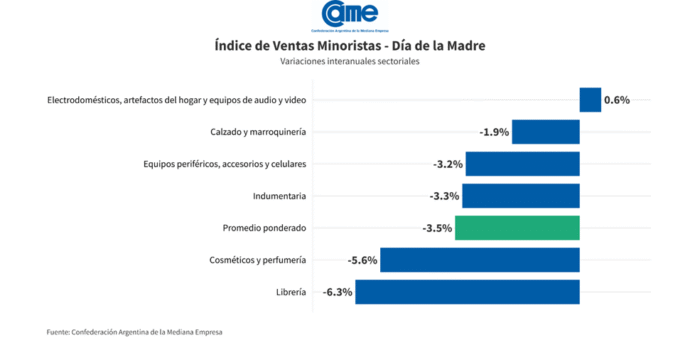 Las ventas en los comercios minoristas pymes durante el Día de la Madre mostraron una retracción del 3,5% frente al mismo período del año anterior, medidas a precios constantes.