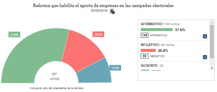 La iniciativa se aprobó con 148 votos a favor y 69 en contra. El oficialismo, promotor de la reforma, logró la mayoría calificada, de mitad más uno de la cámara, con el respaldo del Bloque Justicialista y del Frente Renovador. Votaron en contra el kirchnerismo, el interbloque que preside Felipe Solá y el Frente de Izquierda (FIT).