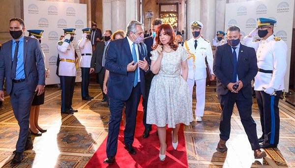 En el tramo más tenso del mensaje, cuando el presidente Fernández respondió ante una nueva interrupción del diputado Iglesias con reproches sobre la emisión monetaria, la vicepresidenta le tomó el brazo al jefe del Estado en un gesto con el que buscó poner paños fríos para que el mandatario no replicara la provocación del legislador opositor.