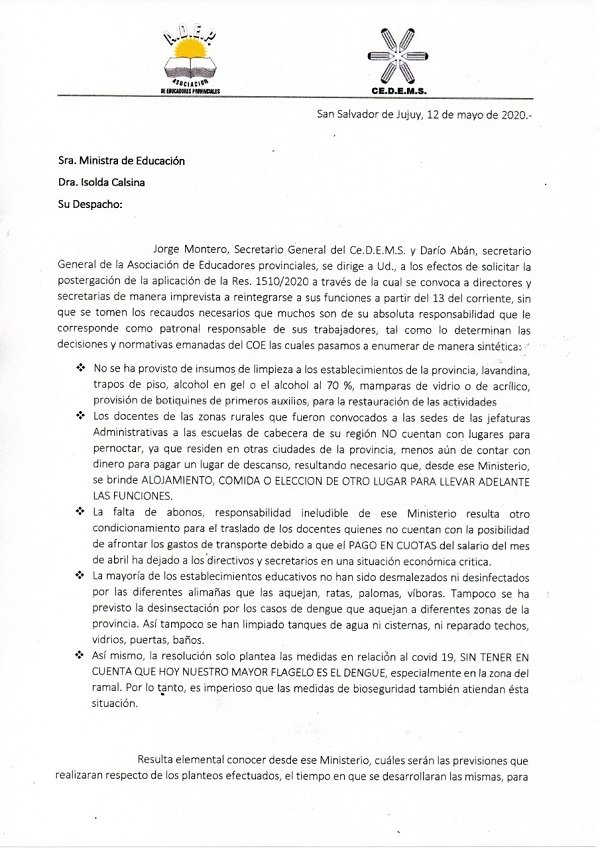 En la misma se dirigen a la ministra de Educación, Isolda Calsina, a efectos de solicitar la postergación de la aplicación de la resolución 1510/2020 a través de la cual se convoca a directores y secretarias de manera imprevista a reintegrarse a sus funciones a partir de hoy, miércoles.