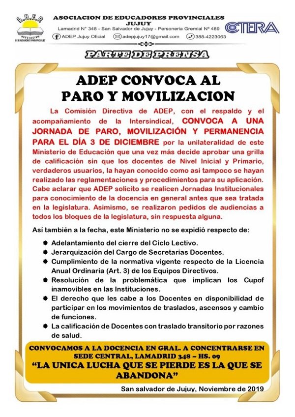 La Asociación de Educadores Provinciales (Adep) determinó una jornada de paro y movilización para este martes en la legislatura contra la sanción de la nueva grille de clasificación docentes. También reclaman por aumento salarial.