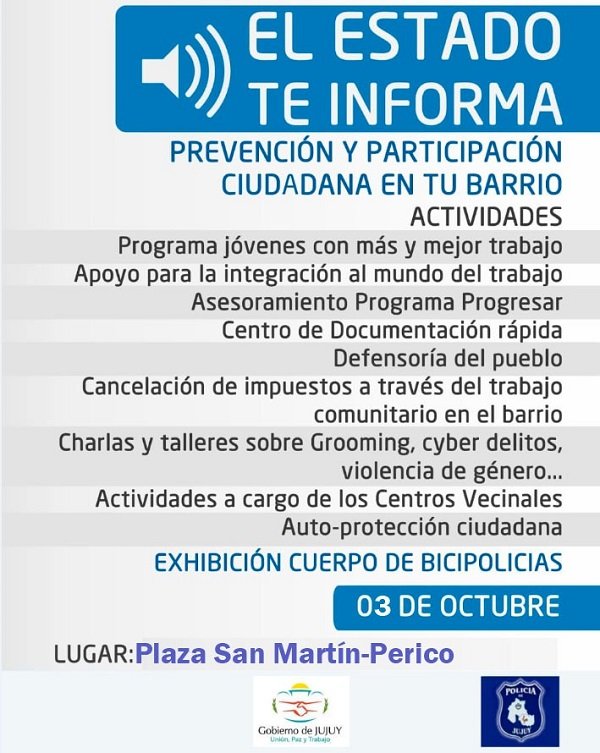 El programa el “Estado te Informa” brindará diferentes servicios este jueves, en la ciudad de Perico, en el horario de 10 a 16 horas, en Plaza San Martín. Los vecinos de esa ciudad podrán realizar tramitaciones gratuitas de DNI, partidas de nacimientos, información sobre el ingreso al Instituto de Seguridad, un buzón donde podrán denunciar de manera anónima, asesoramiento legal comunitario, mediación, charlas de prevención de Adicciones, grooming, servicio de la Defensoría del Pueblo, entre otros servicios.