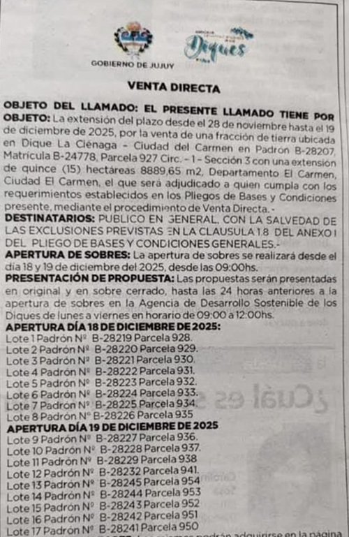 El Gobierno provincial lanzó por tercera vez una convocatoria para la venta directa de 15 a 17 hectáreas en la zona de los Diques, departamento El Carmen, un proyecto inmobiliario exclusivo que se encuentra judicializado en la Corte Suprema de Justicia de la Nación y es resistido por familias campesinas y organizaciones socioambientales.