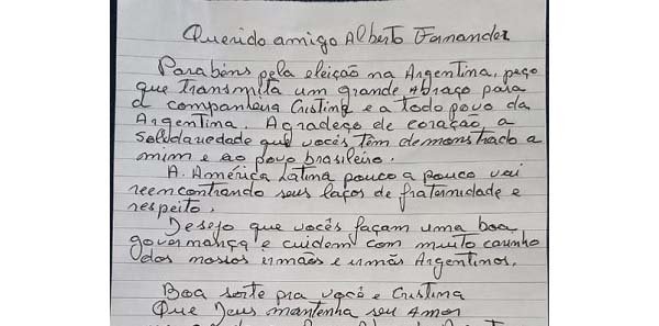 La carta escrita de puño y letra desde la cárcel de Curitiba, donde el líder del Partido de los Trabajadores está detenido desde abril de 2018, también envía un abrazo a la vicepresidenta electa Cristina Kirchner y los convoca a «cuidar con mucho cariño a nuestros hermanos y hermanas argentinos».