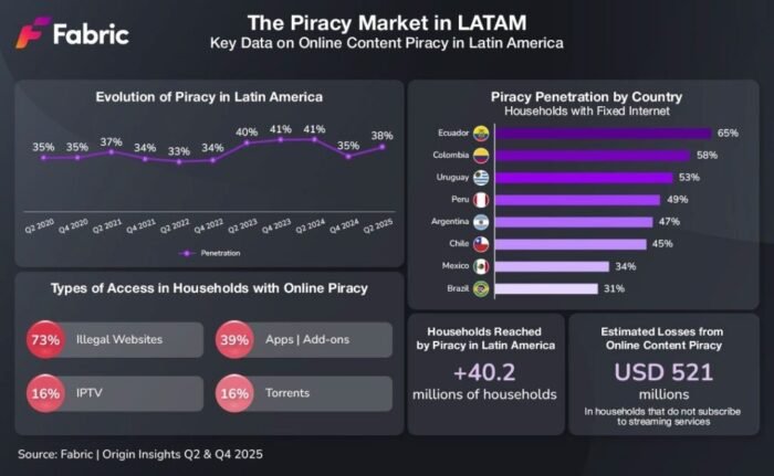 De acuerdo con los últimos datos de Origin, el 38% de los hogares con internet fijo en América Latina accede a contenido pirateado, lo que representa más de 40 millones de hogares en toda la región.
