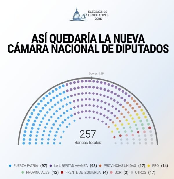 Con estos resultados, La Libertad Avanza estaba sumando 64 nuevos diputados que se suman a los 29 que tenían dos años más de mandato y otros aliados como los trece diputados del PRO. De esa forma, el oficialismo superaba largamente el tercio para blindar los vetos y quedaba en una posición más cómoda para acercarse al quórum.