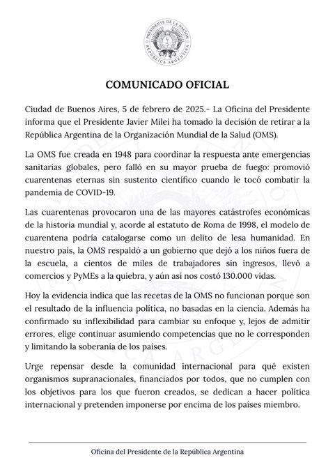 La decisión del gobierno ultraderechista de LLA es una idea que se estudió desde hace tiempo y que cobró vigor en las últimas horas con los recientes anuncios de Donald Trump, quien antes de volver a la Casa Blanca calificó de “mala” a la gestión de la OMS durante la pandemia. El mismo argumento que acompañó el anuncio hecho hoy en Casa Rosada.