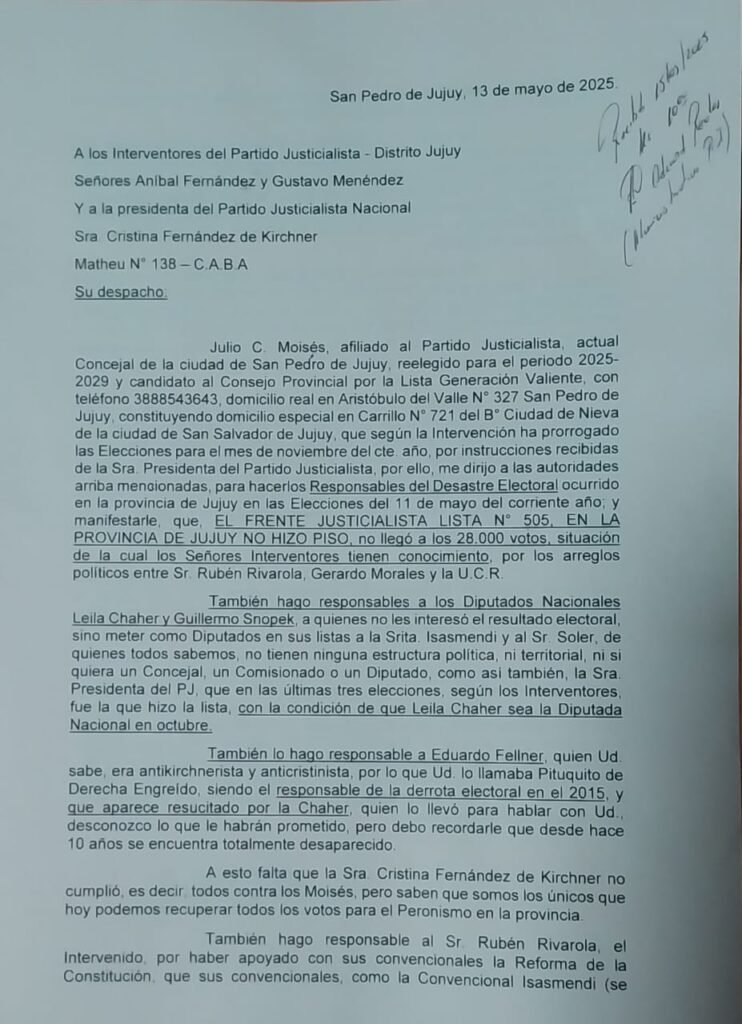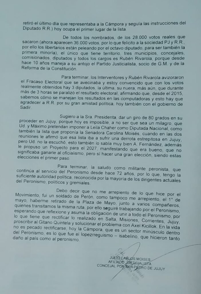 Siguió repartiendo culpas, “lo hago responsable a Eduardo Fellner, quien Ud. sabe, era y es antikirchnerista y anticristinista, siendo el responsable de la derrota electoral en el 2015, y que aparece resucitado por Chaher, quien lo llevó para hablar con Ud. Desconozco lo que le habrán prometido, pero debo recordarle que desde hace 10 años se encuentra totalmente desaparecido».