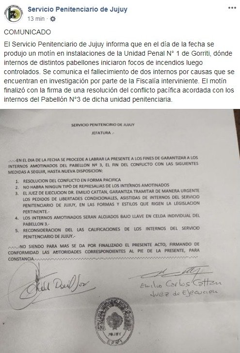 El Servicio Penitenciario de Jujuy informa que en el día de la fecha se produjo un motín en instalaciones de la Unidad Penal N° 1 de Gorriti, dónde internos de distintos pabellones iniciaron focos de incendios luego controlados.