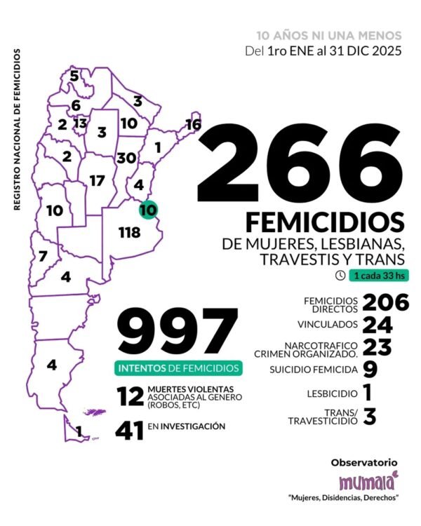 Durante 2025 se registraron 266 femicidios, travesticidios, transfemicidios y femicidios vinculados en Argentina, lo que equivale a un crimen por odio de género cada 33 horas. Los datos surgen del informe anual elaborado por el Observatorio del colectivo Mujeres de la Matria Latinoamericana (MuMaLá), a 10 años del Ni una menos.