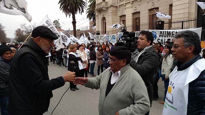 La protesta de los docentes y la movilización del Sindicato de Empleados y Obreros Municipales (Seom) confluyeron en la mañana de este lunes en la plaza Belgrano, frente a la Casa de Gobierno. Los municipales resolvieron un paro provincial de 24 horas ante la liquidación compulsiva del 6 por ciento de aumento para el mes de julio, y exigen la inmediata reapertura de paritarias en las que se discuta el 38 por ciento de aumento propuesto por el gremio.